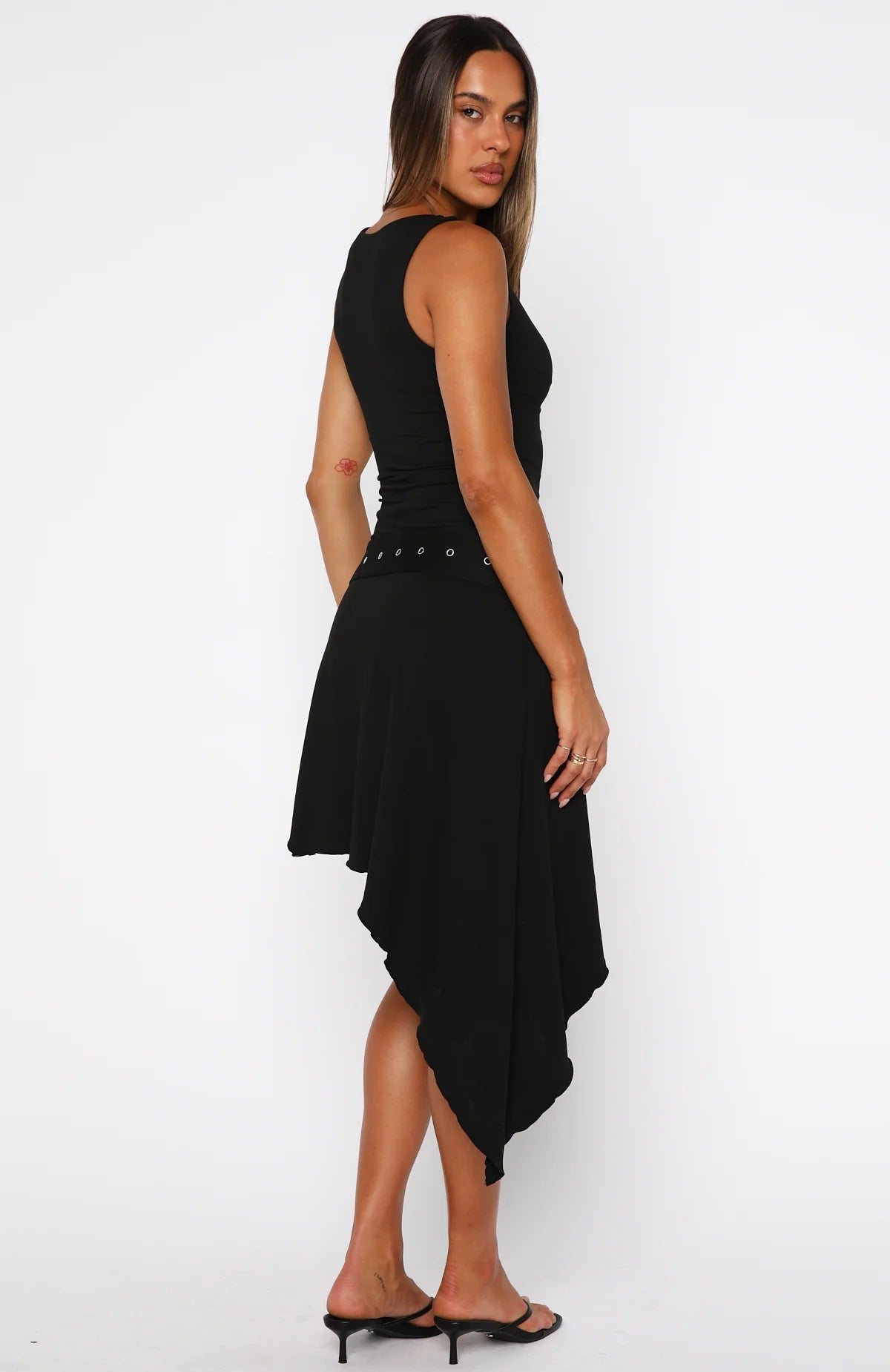 Look chic in the Worth My Time Midi Dress in Black! Features a refined jewel neckline, a sculpting fitted bodice, and an eye‑catching asymmetrical hem. Fully lined and crafted from high-stretch fabric, it features a detachable, oversized belt to define your waist. Style it with sleek heels and minimalist accessories for a chic, polished finish.