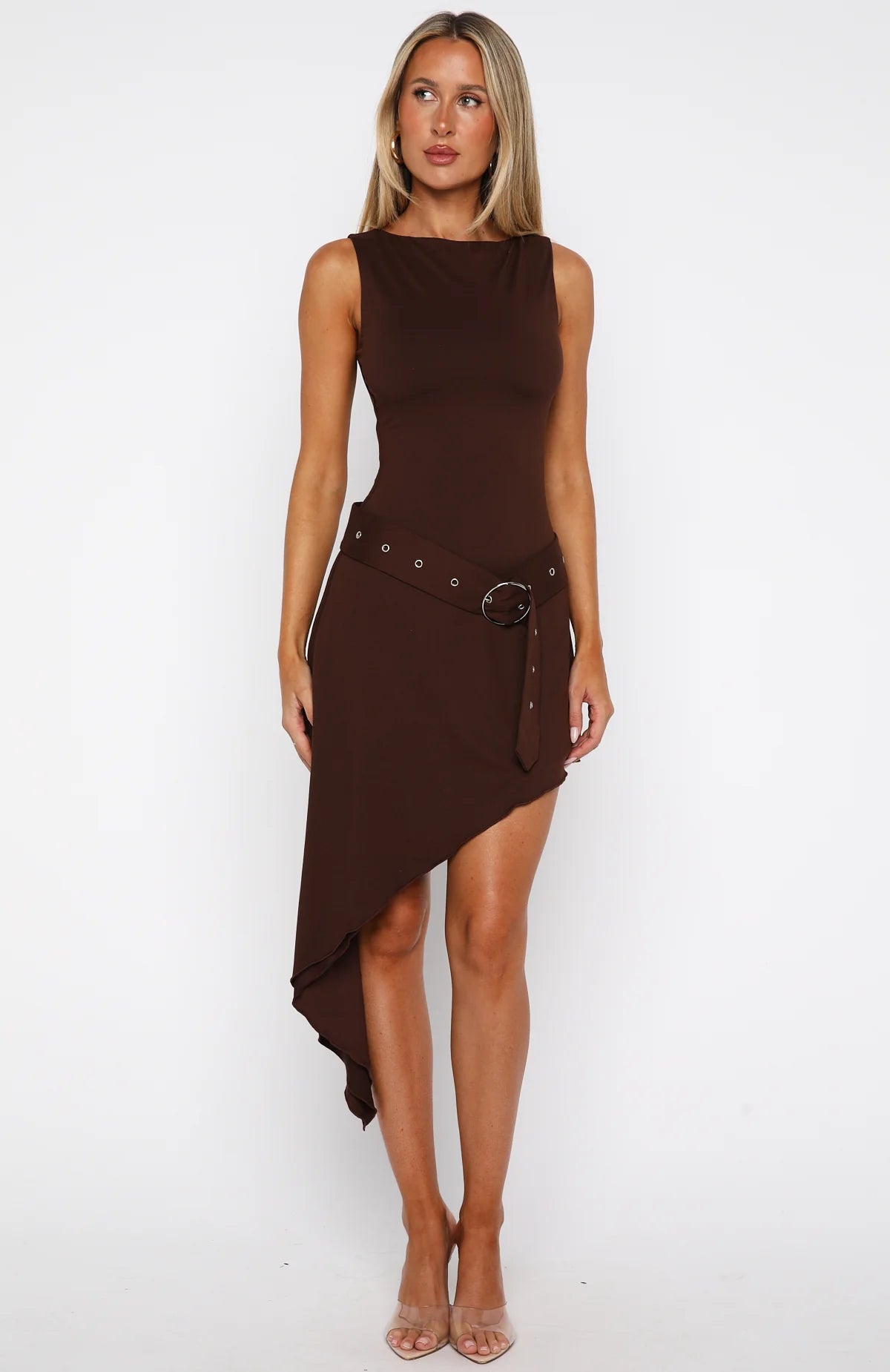 Look Classique in the Worth My Time Midi Dress in Chocolate! Features a refined jewel neckline, a sculpting fitted bodice, and an eye‑catching asymmetrical hem. Fully lined and crafted from high-stretch fabric, it features a detachable, oversized belt to define your waist. Style it with sleek heels and minimalist accessories for a chic, polished finish.