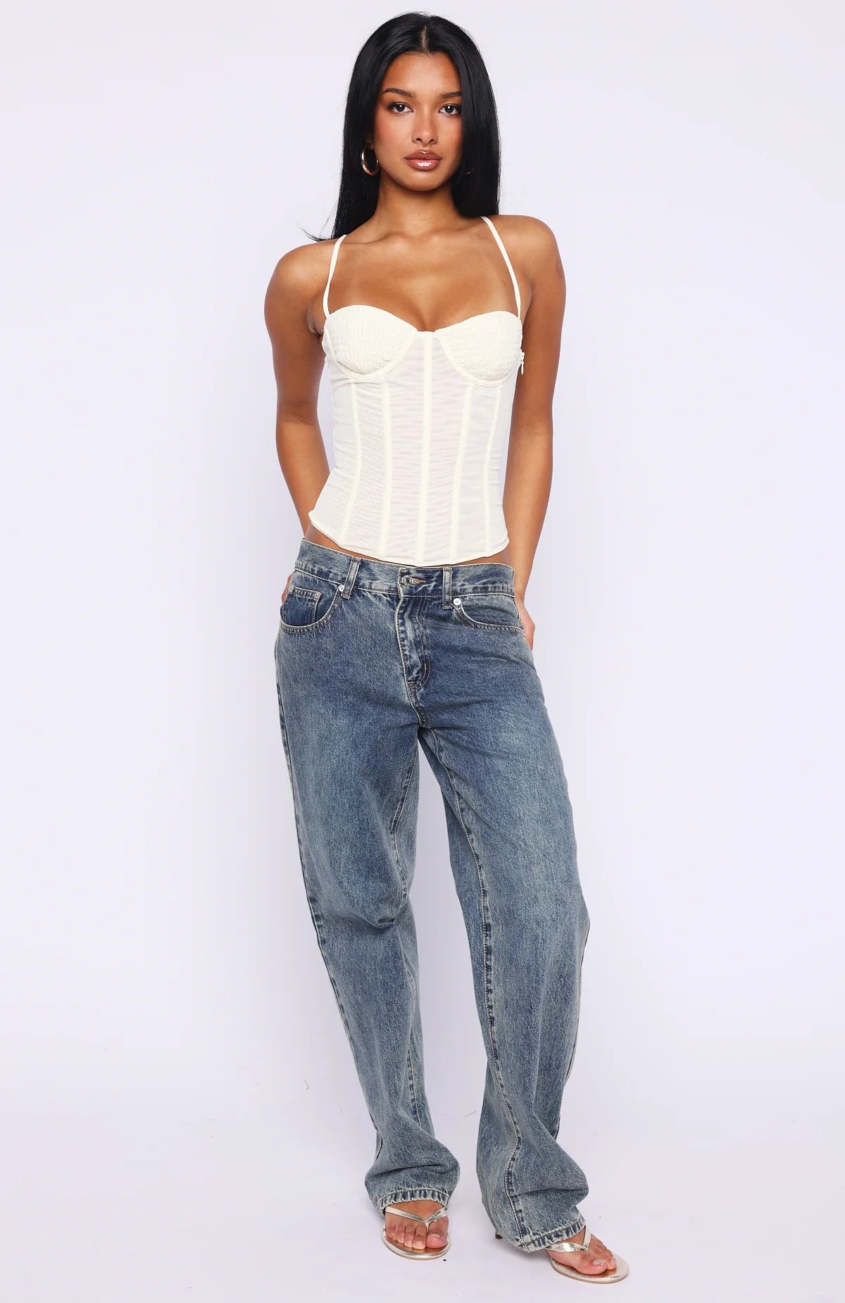 Girls just want to have and why not in the Your Dream Bustier in Cream. Designed with thin adjustable shoulder straps, ruched bust cups with under-wire support, and internal boning for a flattering, contoured fit. The sheer bodice and fitted silhouette add a touch of sultry elegance, while a side zipper ensures a clean finish. Style with your go-to denim jeans, wedges and layered gold jewellery for a chic look.