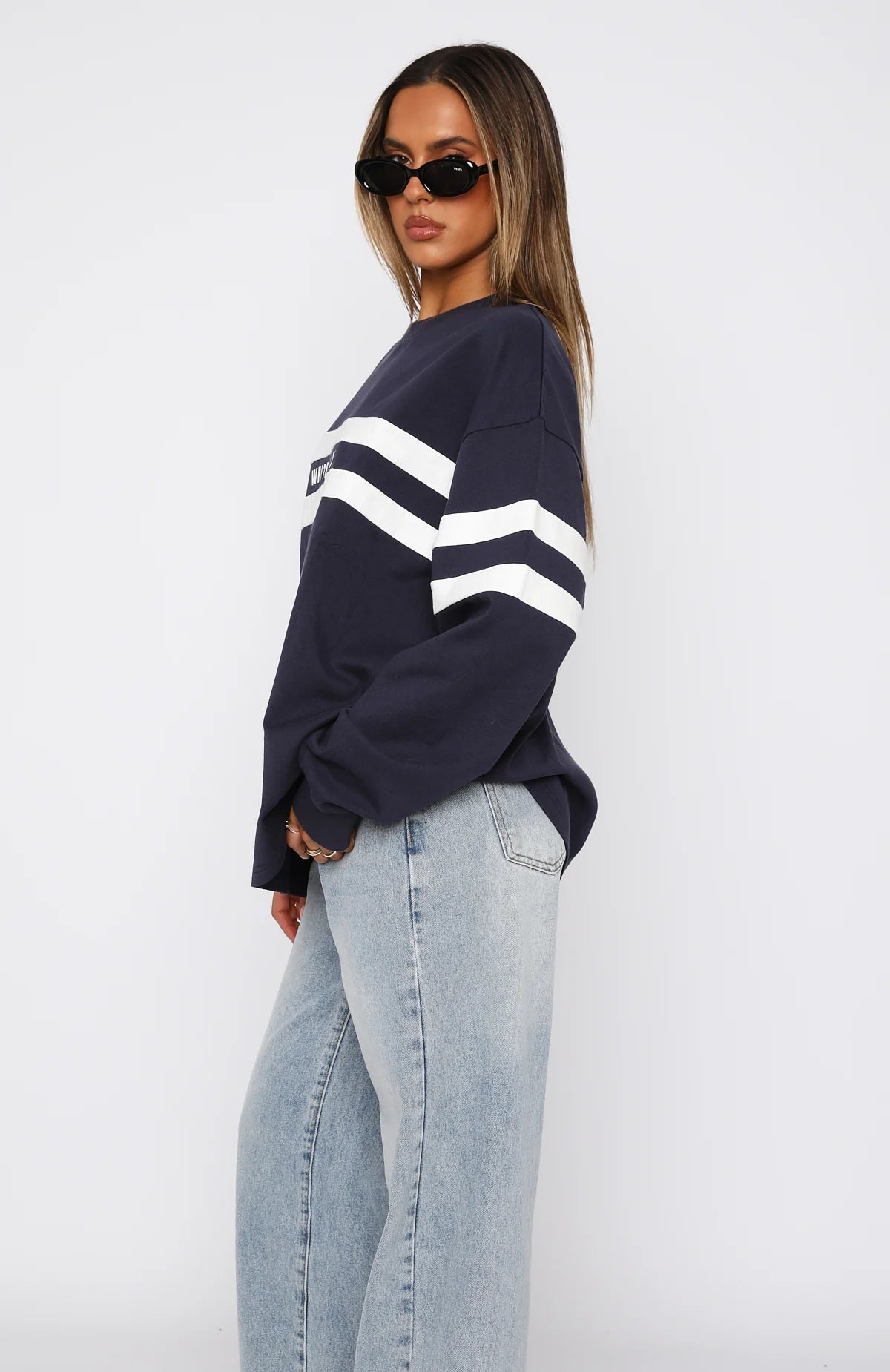 You’ll be wearing this shirt on rotation all year round'! The You're My Inspiration Long Sleeve Tee Navy features a high scoop neckline, long sleeves, printed logo centre front design, oversized fit with drop shoulders and unlined. Feel comfy while staying on trend.